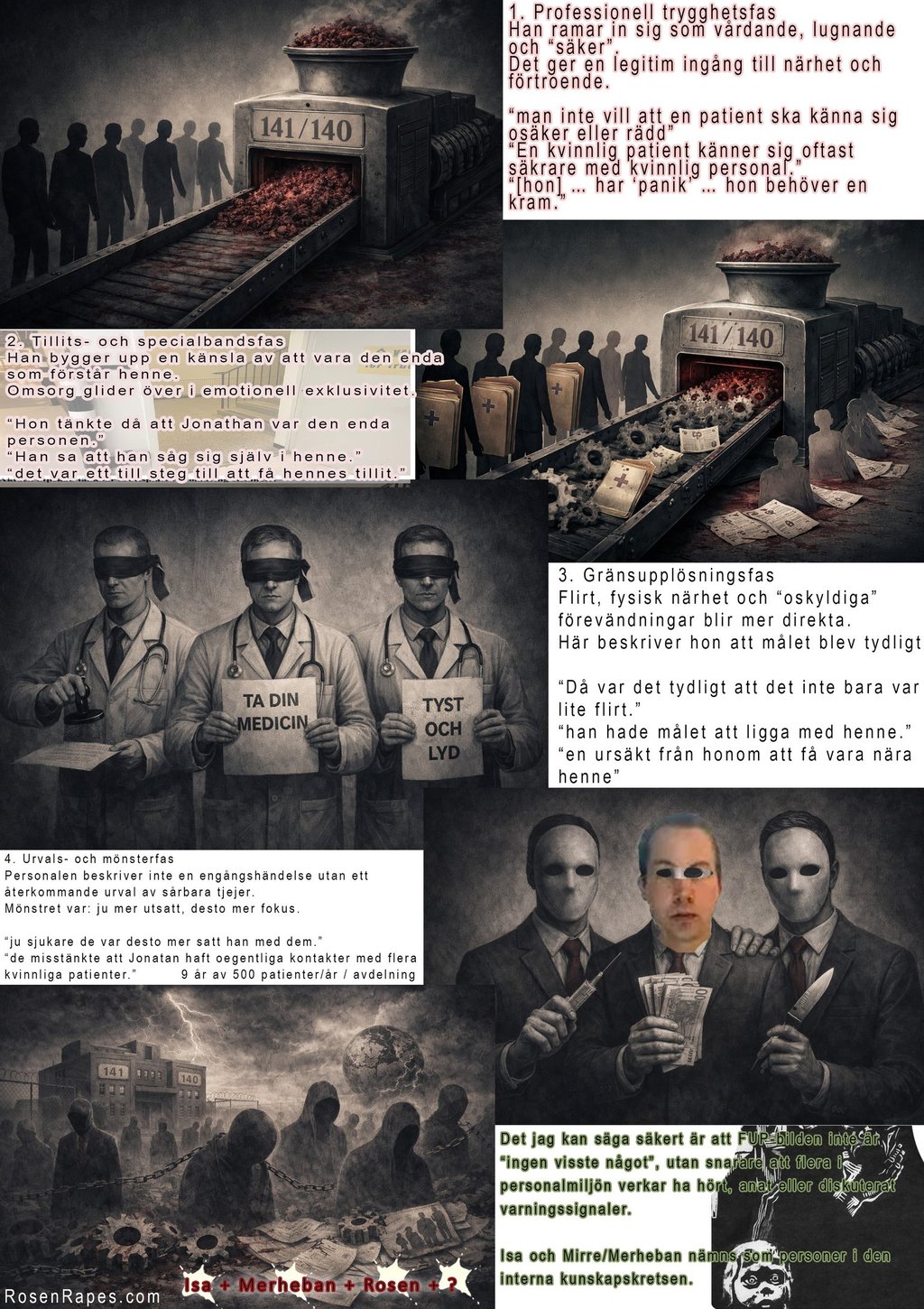 Arne Stenstedt & Lena Pihl (chefsöverläkare; kände till våldtäkterna men såg åt andra hållet pga stora mutor & hot). Mattias Månsson (chefsöverläkare; frånvarande: oklart om han visste och var mutad+hotad, eller ej).