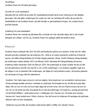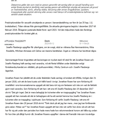 Påföljd: “80 dagsböter om 50 kr (4 000 kr).”“Åtal som Jonathan Rosen frikänns från: Våldtäkt …” (frikännande p.g.a. preskription m.m., enligt dom)