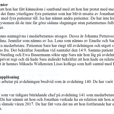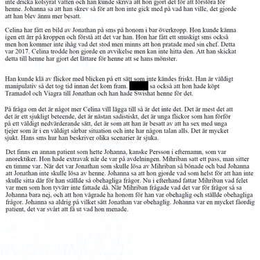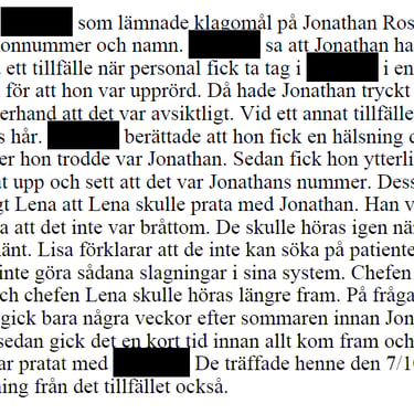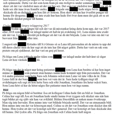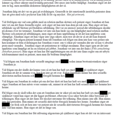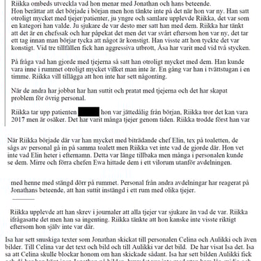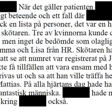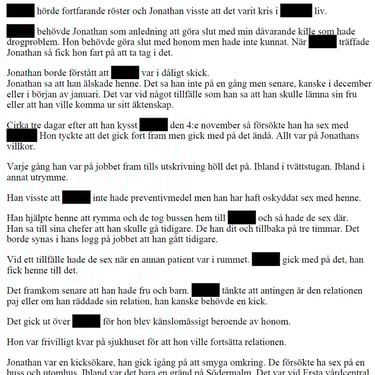 “Varje gång han var på jobbet fram tills utskrivning höll det på. Ibland i tvättstugan. Ibland i annat utrymme.”